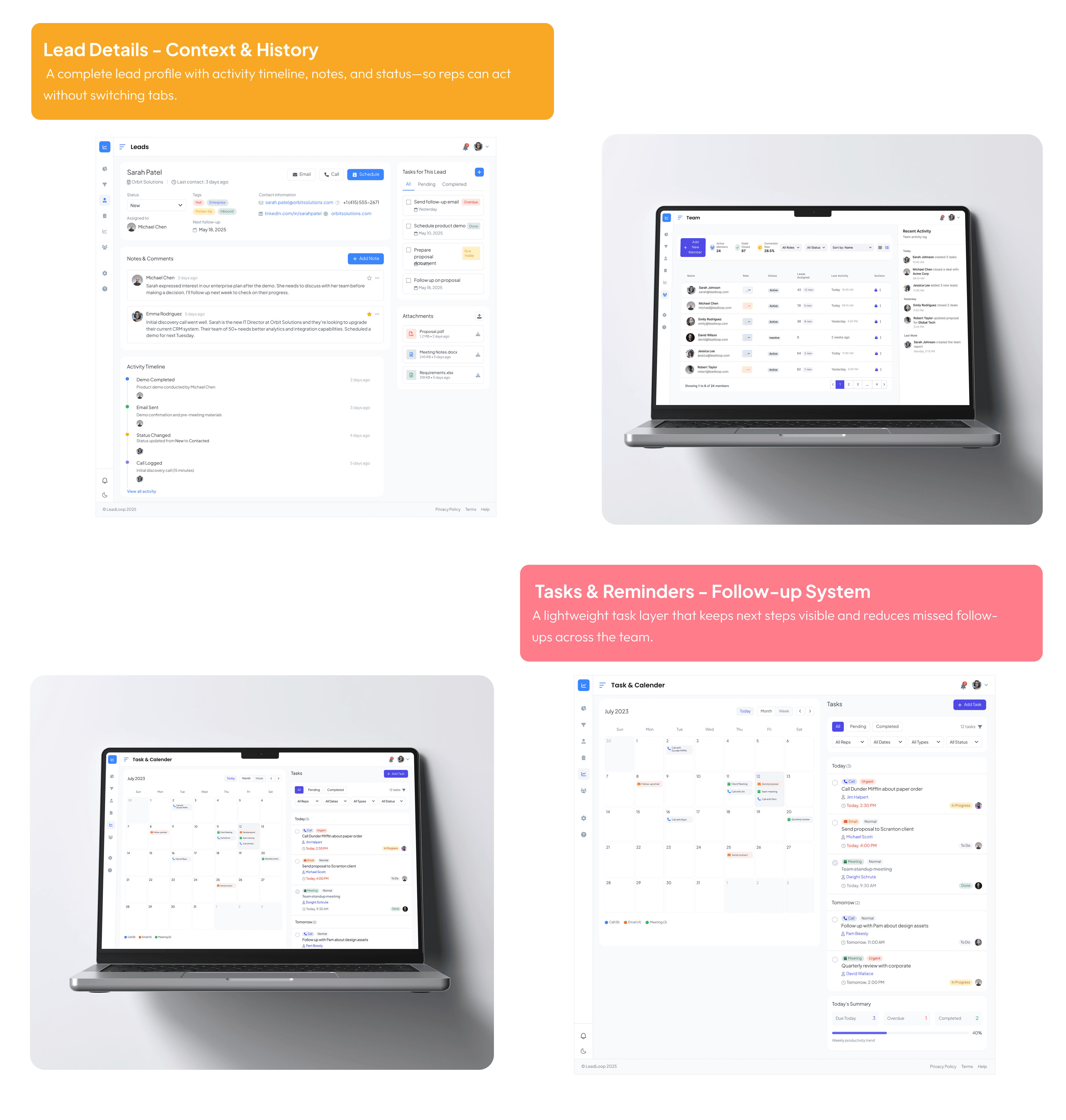 The layout answers these quickly through pipeline stages, lead context, activity history, and tasks/reminders.