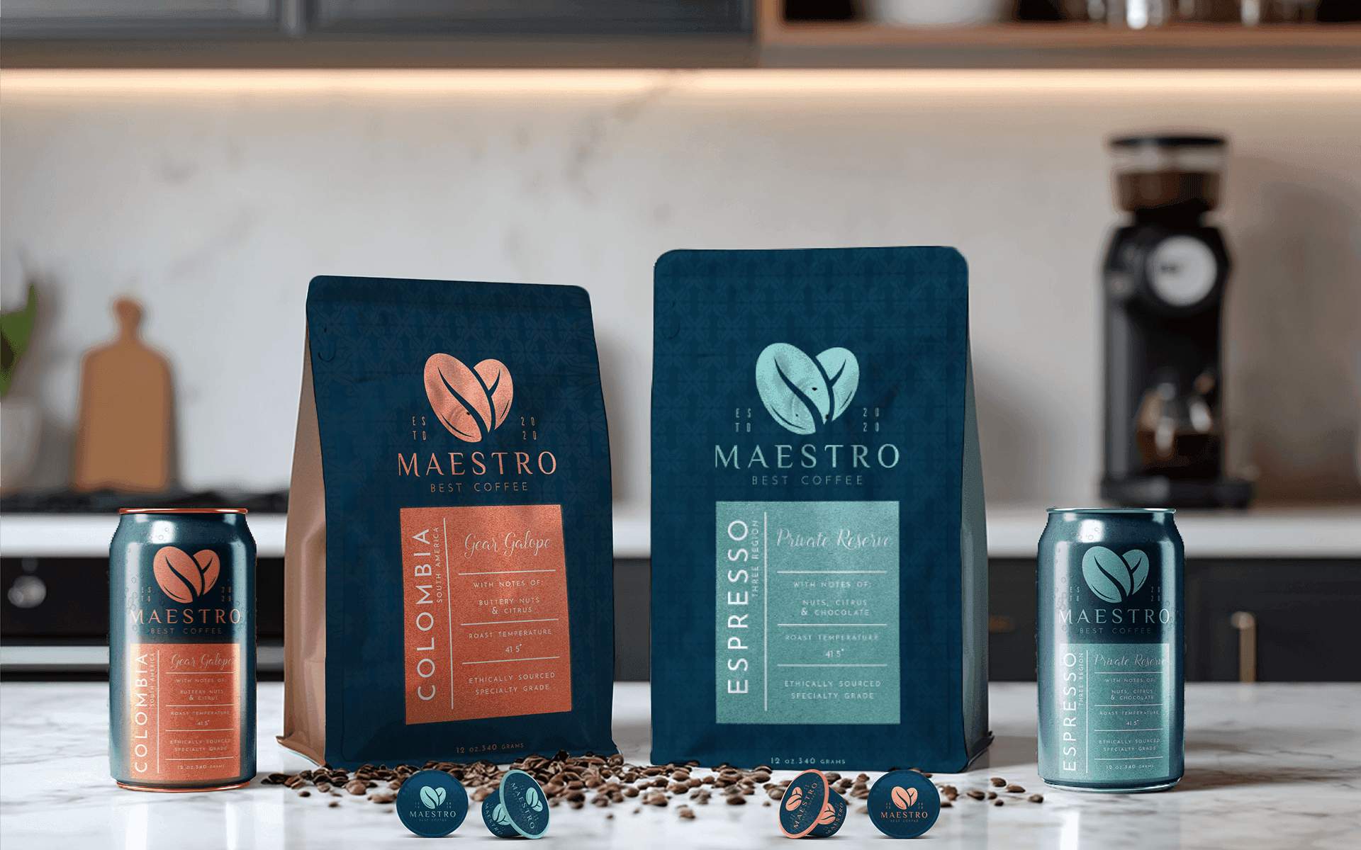 MAESTRO needed a brand presence that could stand out in a crowded specialty coffee category while staying timeless. The main challenge was building a system that looks consistent across multiple products and surfaces, not just a logo.