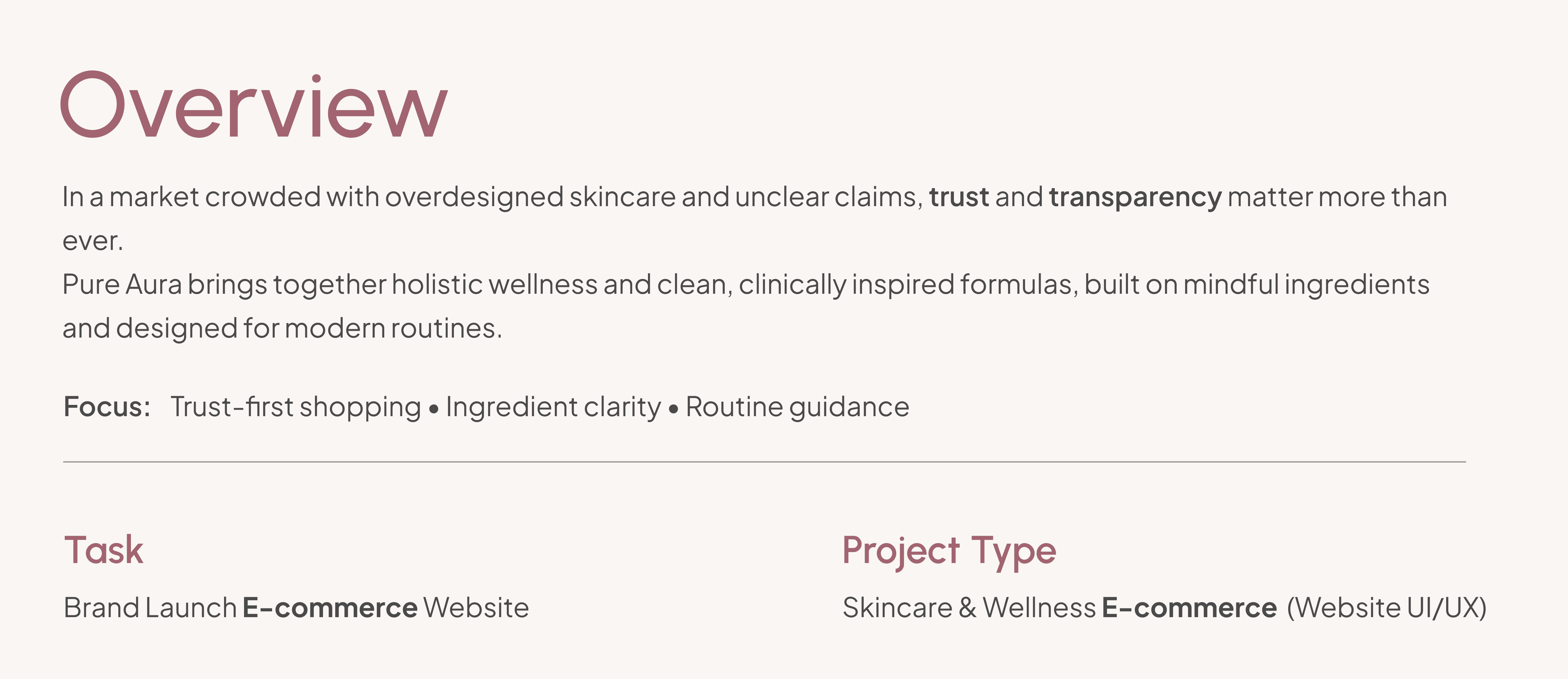 Create a premium e-commerce website that feels calm, credible, and easy to shop. | Skincare shoppers who care about ingredients, results, and routine clarity. | Key pages designed: Homepage, Product Page, About, Category/Collection, Support. |